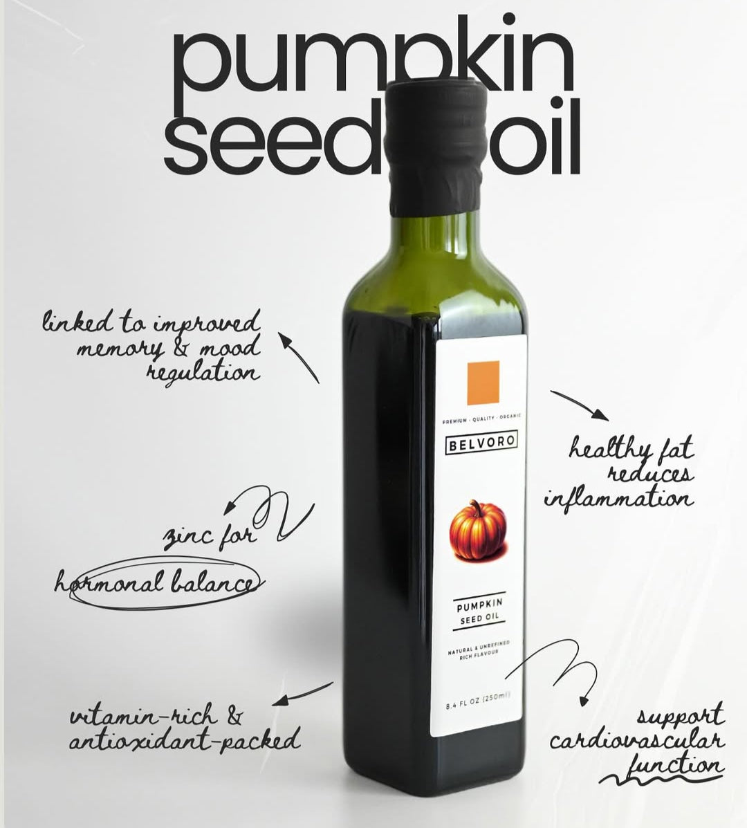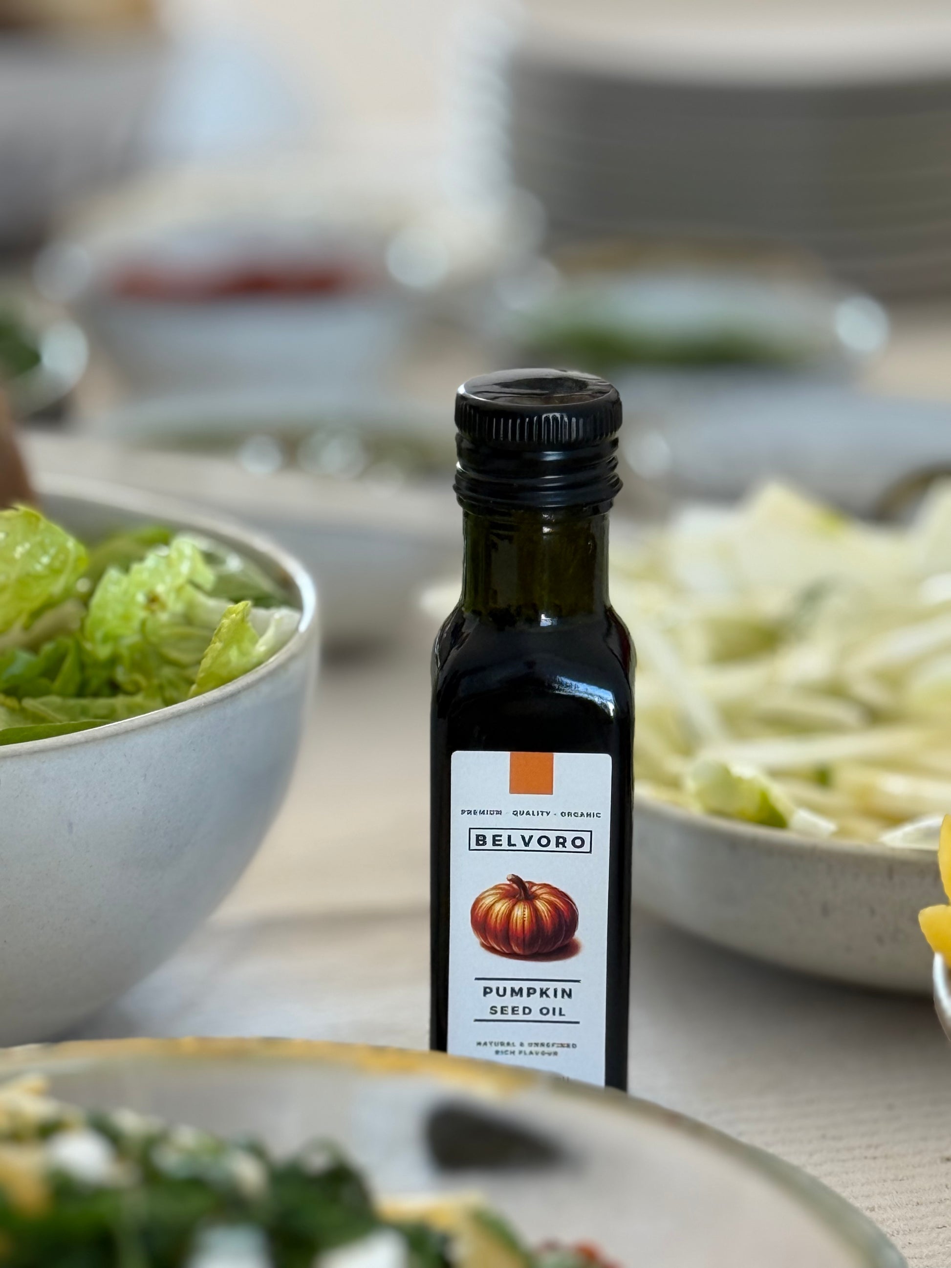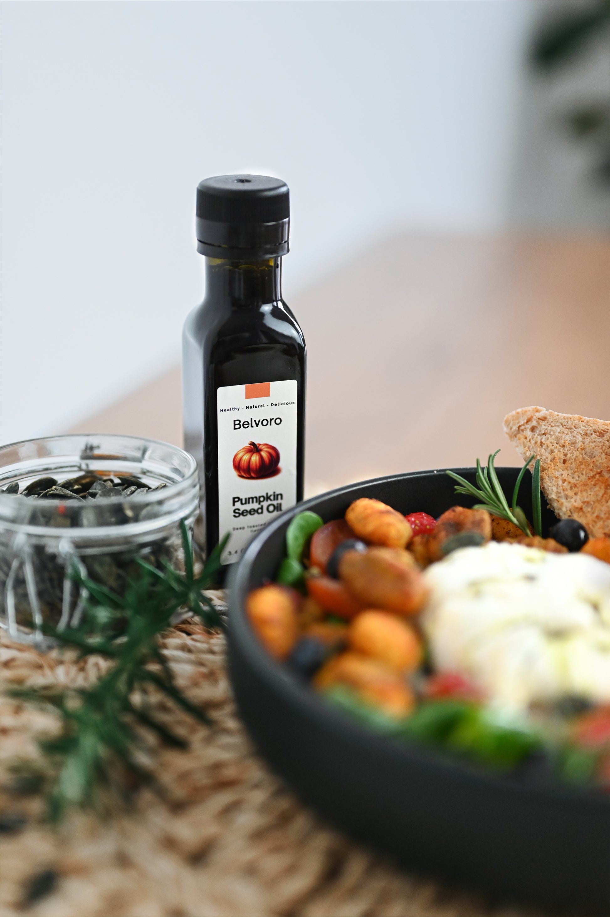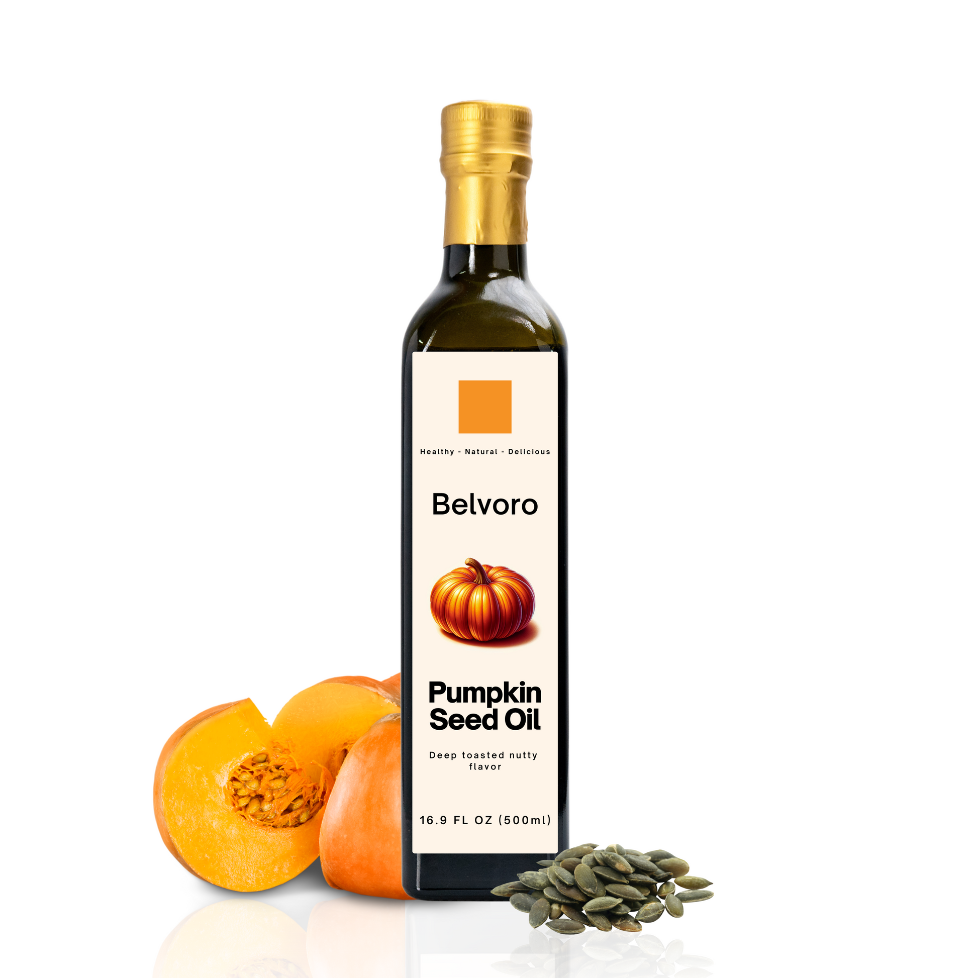 Discover the exquisite taste and numerous health benefits of Belvoro 100% Unrefined Pumpkin Seed Oil. Elevate your meals and well-being with every drop.