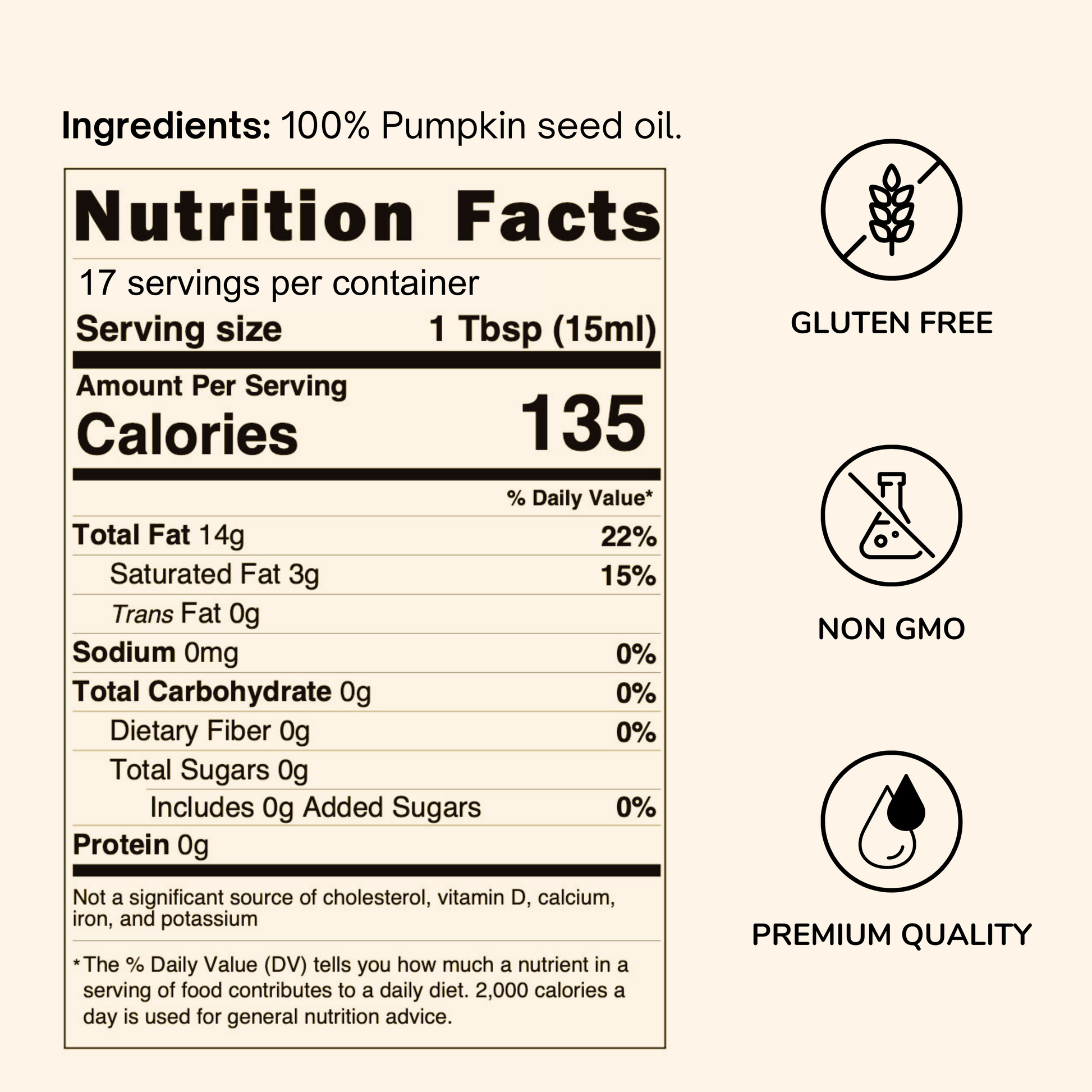 Enjoy the pure, nutty flavor of our oil, made exclusively from 100% pumpkin seeds. Each bottle preserves the natural goodness and rich nutrients of premium, sustainably sourced seeds.